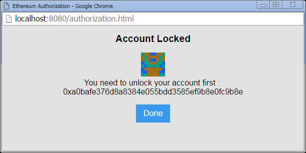 When the account is locked, and the node does not provide access to account unlocking via its rpc interface, the following popup will be presented. This is not ideal since this requires the user to know how to unlock an account:
