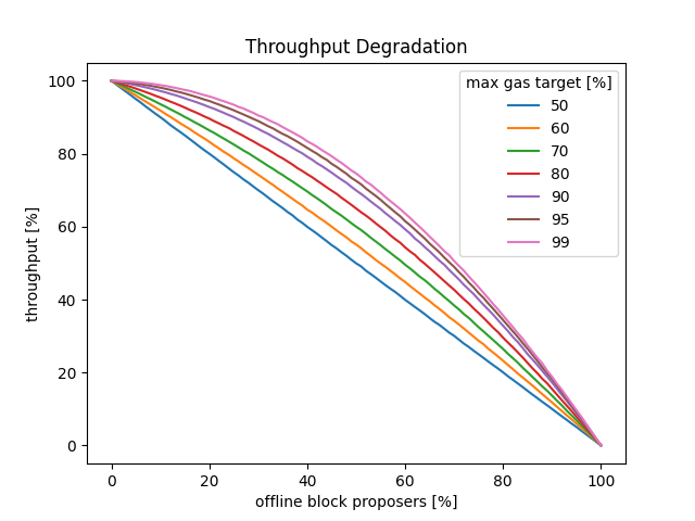 However, this means that even a single missed slot cannot be fully compensated. Even worse, any second or further sequential missed slot cannot be compensated for at all, as the gas target is already at its max. This effect becomes more pronounced as the share of offline validators increases: