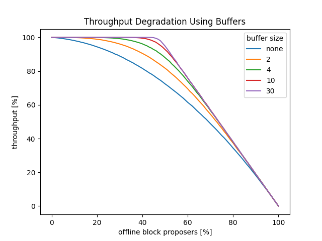 To be able to compensate multiple consecutive missed slots, a gas buffer could be introduced, that would allow the gas beyond the block elasticity to be carried forward to future blocks. To avoid long-run buffer accumulation that would delay a return to normal operations once block proposers are back online, a cap on the buffer would be added. Even for a relatively small buffer cap, the throughput robustness is significantly improved: