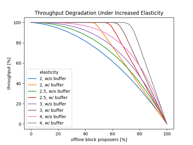 In addition to the introduction of a buffer, increasing the block elasticity is another tool for increasing throughput robustness. The following diagram shows the effect of different elasticity levels, both in the presence and absence of a persistent buffer: