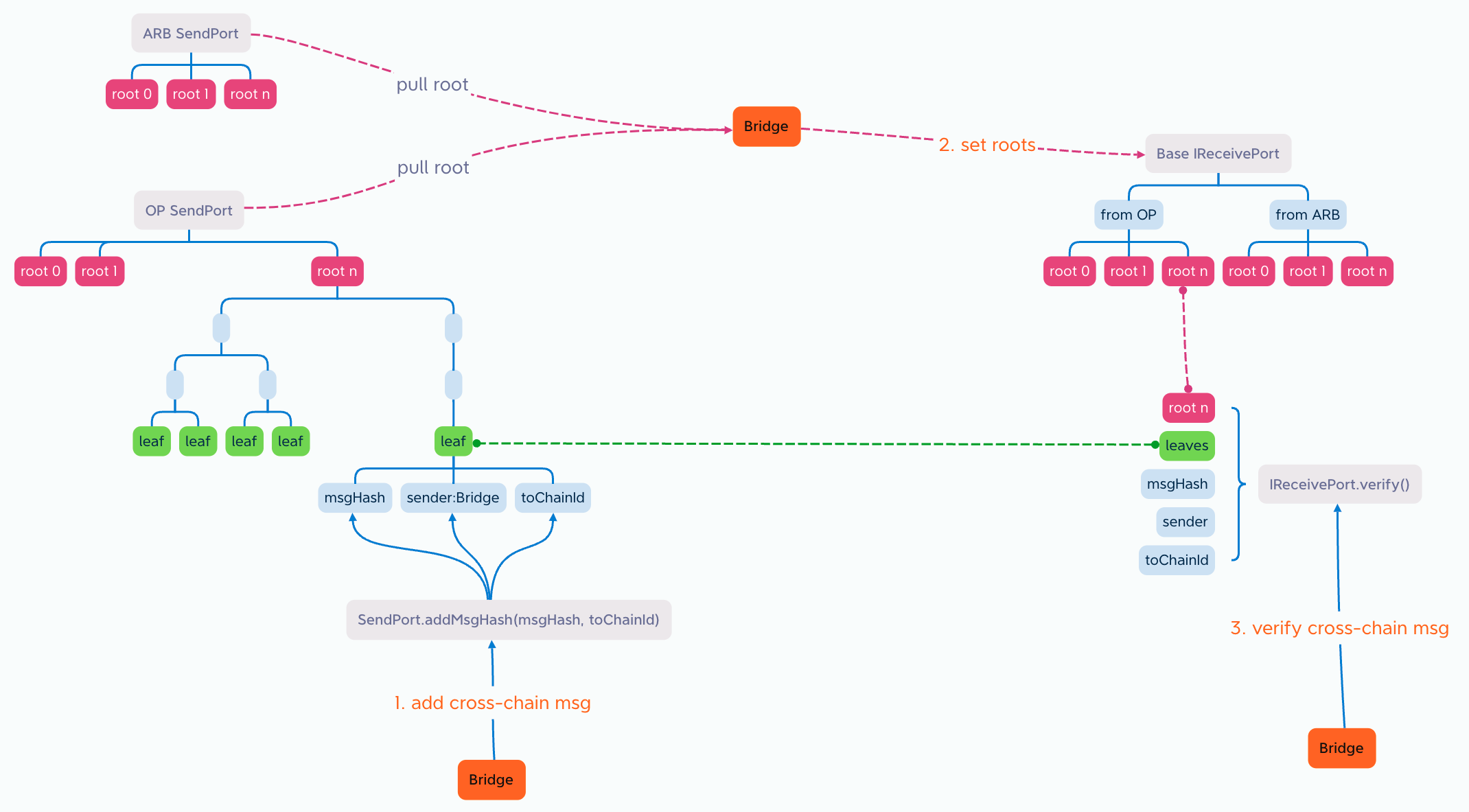Upon the completion of packing a new MerkleTree, the package carrier (usually the cross-chain bridge project) pulls the root from multiple chains and stores it in the IReceivePort contract of each chain.