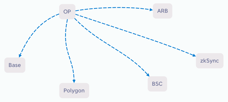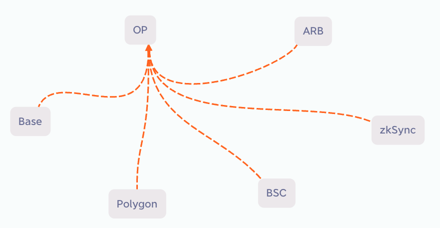 Using the pull approach allows the batch of cross-chain messages from 5 chains into 1 transaction, significantly reducing the number of required cross-chain bridges, as illustrated in the following diagram: