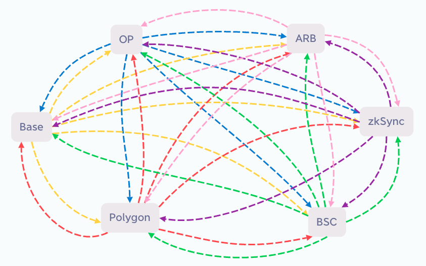 If there are 6 chains, each chain needs to push to the other 5 chains, resulting in the requirement of 30 cross-chain bridges, as shown in the diagram below: